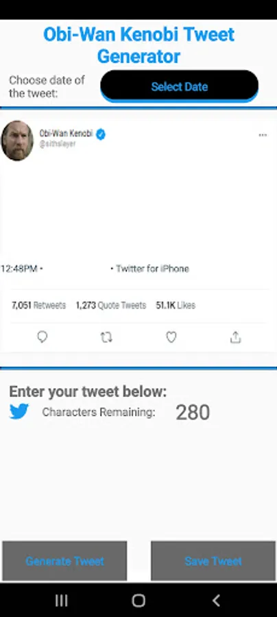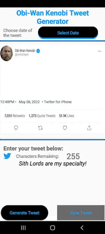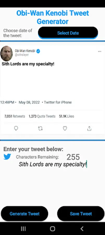This simple app lets you choose a date and a customized twitter message and creates a meme that looks as though Obi Wan tweeted the message.