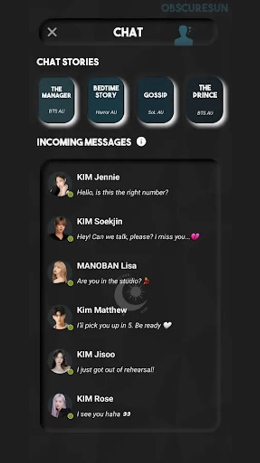 KPOP: Love Stories is a role-playing app where you can chat, talk, date and have amazing stories with your favorite Idols, Actors and Actresses.