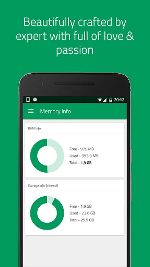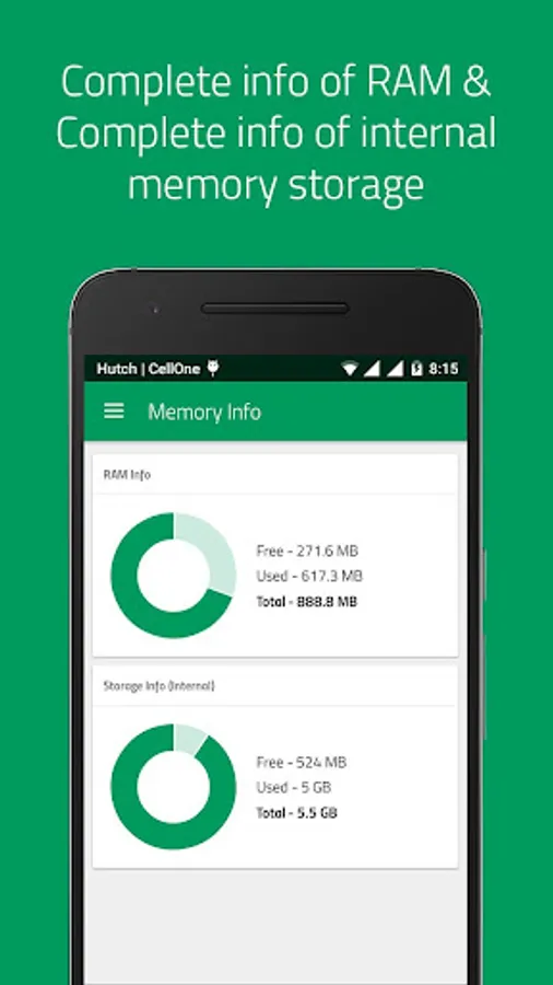 Memory Info allows you to check complete information of memory of your device including RAM, Internal Storage (ROM) and External Storage (SD Card).
