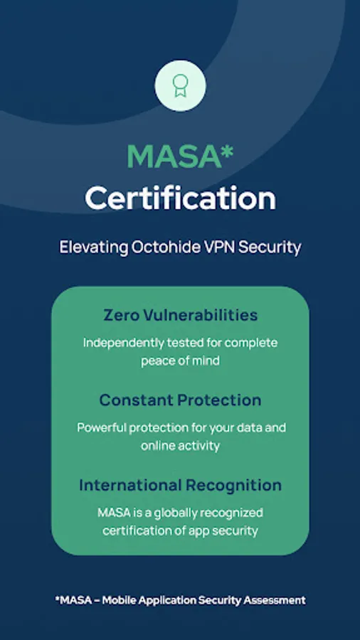 Octohide VPN holds MASA (Mobile Application Security Assessment) certification, demonstrating our commitment to the highest industry standards for mobile security. Independent verification confirms our app's ability to protect your data and privacy.