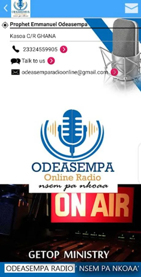 Odeasempa Radio is an online Christian radio station established by the Getop Ministry under the leadership of Rev. Emmanuel Odeasempa. Install and listen to Odeasempa Radio and you life will never ever be the same.