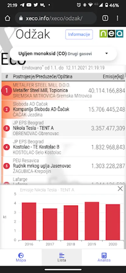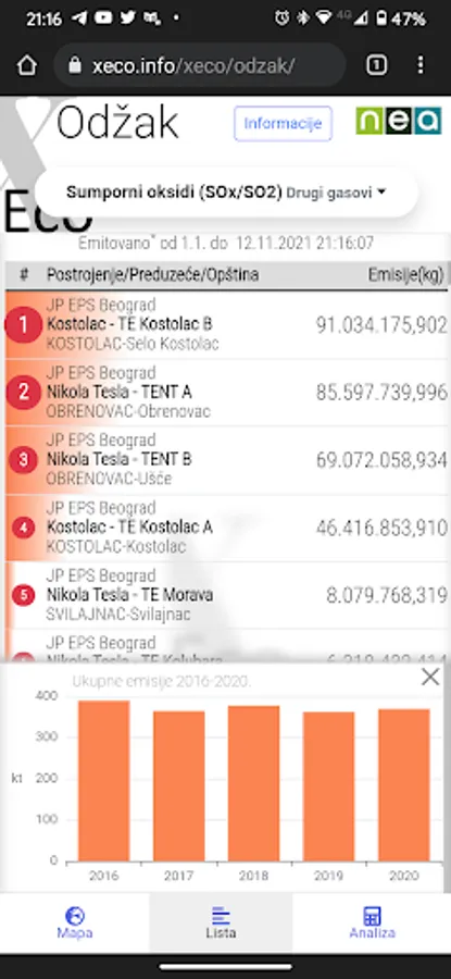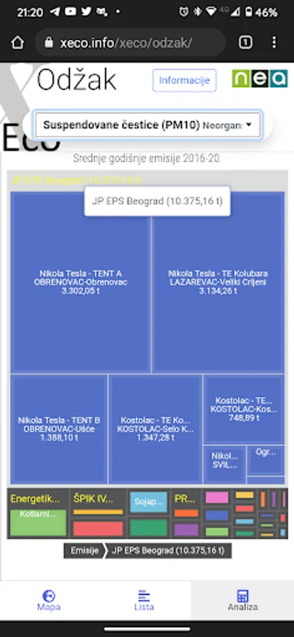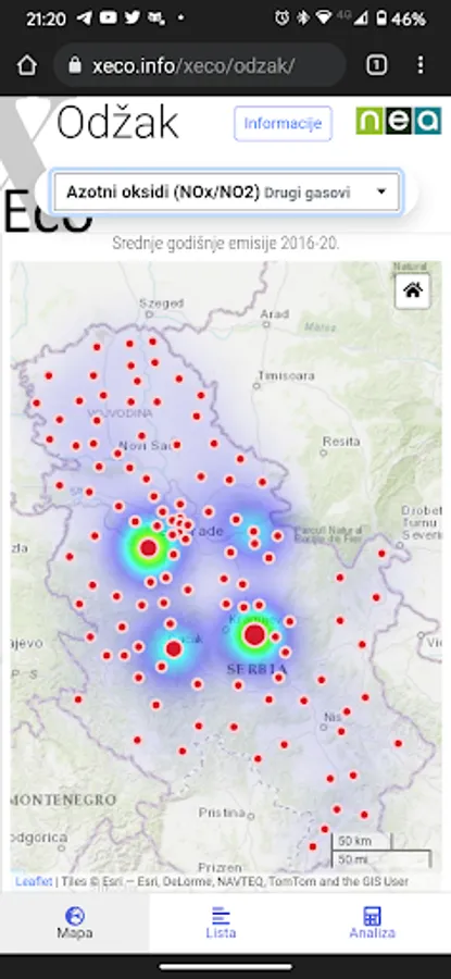 The application xEco Odžak ("eXtreme ECOlogy" - Extreme Ecology) displays data on emissions of pollutants into the air in the Republic of Serbia using data on emitted substances that companies independently submit annually to the National Register of Pollution Sources. Methodology, pollutants, or criteria according to which an individual company becomes obligated to report are given in the Ordinance on the methodology for creating a national and local register of pollution sources, as well as the methodology for types, methods and deadlines for data collection, while limit values are determined by the Limit Regulation. emissions of pollutants into the air from combustion plants, ie the Decree on Limit Values of Emissions of Pollutants into the Air from Stationary Sources of Pollution, except for combustion plants.