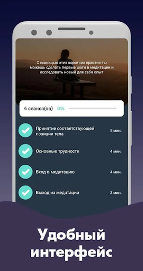 The main idea of the application is in teaching those who want the art of meditation at home. The application will help increase personal performance, get rid of stress, anxiety, improve sleep, concentration and develop self-awareness.