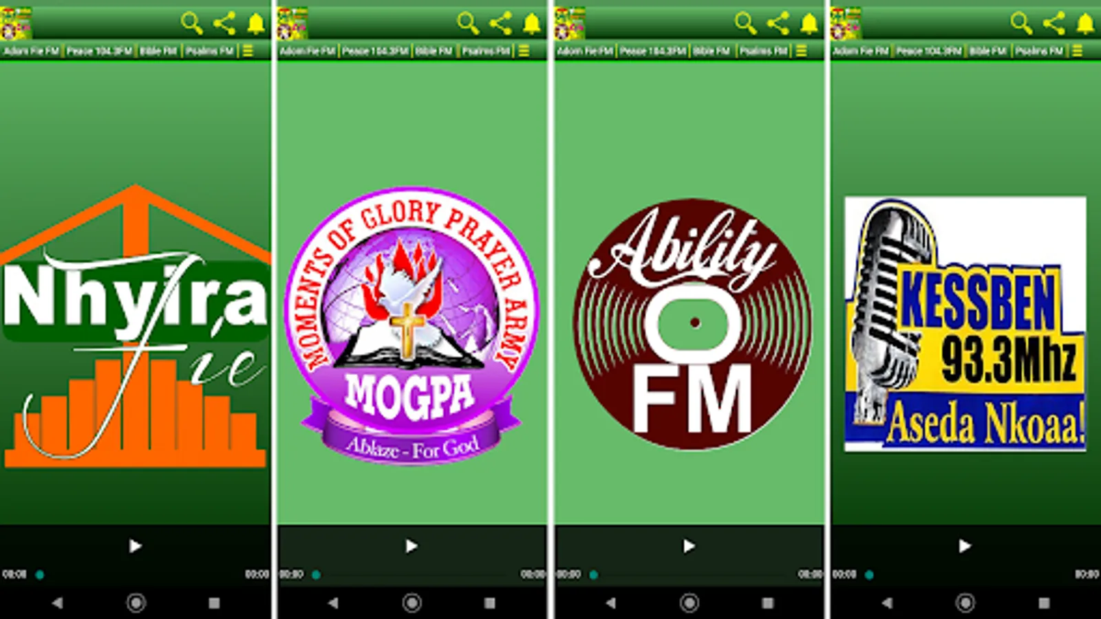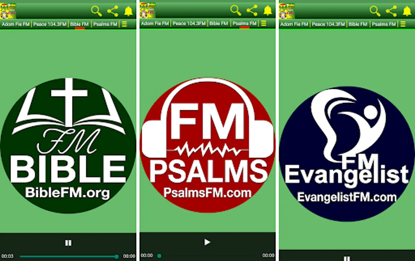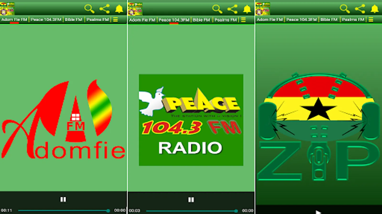 Featuring Peace 104.3 FM, Citi 97.3 FM, OMAN 107.1 FM, Okay 101.7 FM, Angel 102.9 FM, MOGPA Radio, Adom Fie FM, Nhyira Fie FM, 1A GhanaZip, ACCRA24, Ability OFM Radio, Bible FM, Psalms FM, Evangelist FM, EndTime Prayer Radio, Hallelujah Radio USA, KG Christian Radio Ghana, Amansan FM UK, Sources Radio UK, Kessben 93.3 FM, New Covenant Gospel, Sankofa Radio and More Radio Stations.