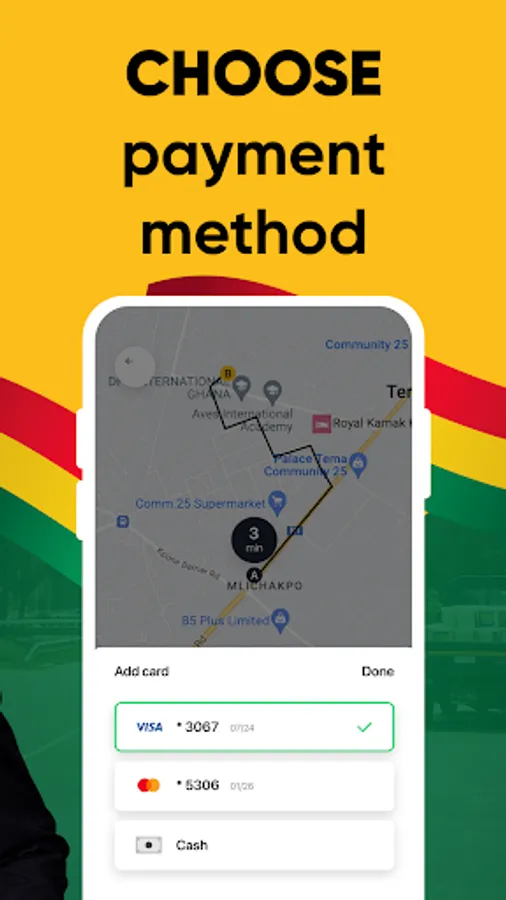 Once your account is ready, use OGB Ride: affordable cab rides online and choose the service ride hailing or delivery. After you order affordable rides in the Accra Area, the app will alert you when the driver has arrived. After the payment the bill will be sent to your email.