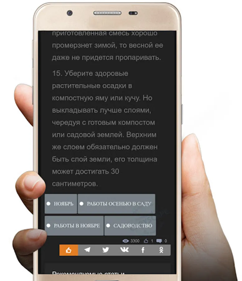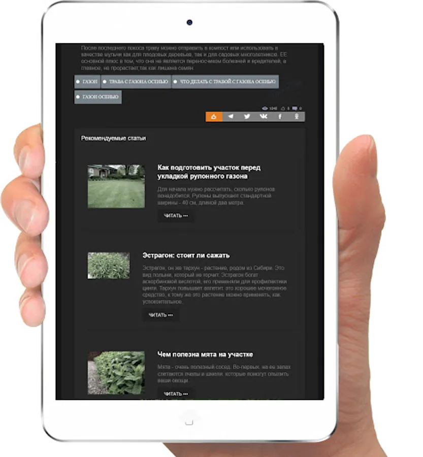 The application implements keyword search. for example, you decide to plant currants and do not know how, where and what to do next with it in order to achieve excellent yields. You enter the query "currant" - and get materials for planting, pruning, top dressing, etc. Decided to build a house - no problem. Query "foundation" - 50 articles from "which foundation to choose" to "drainage and reinforcement of the foundation."