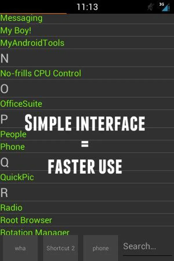 -Textual Launcher implements a fast search of apps. Find immediately the apps that you want to launch thanks to the Search feature and the comfortable alphabetic sorting.