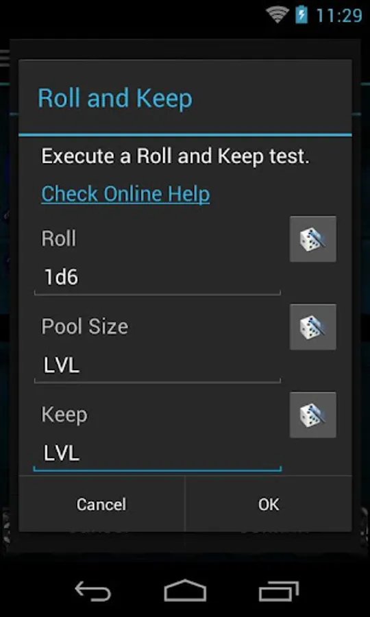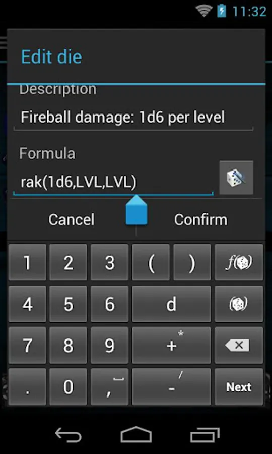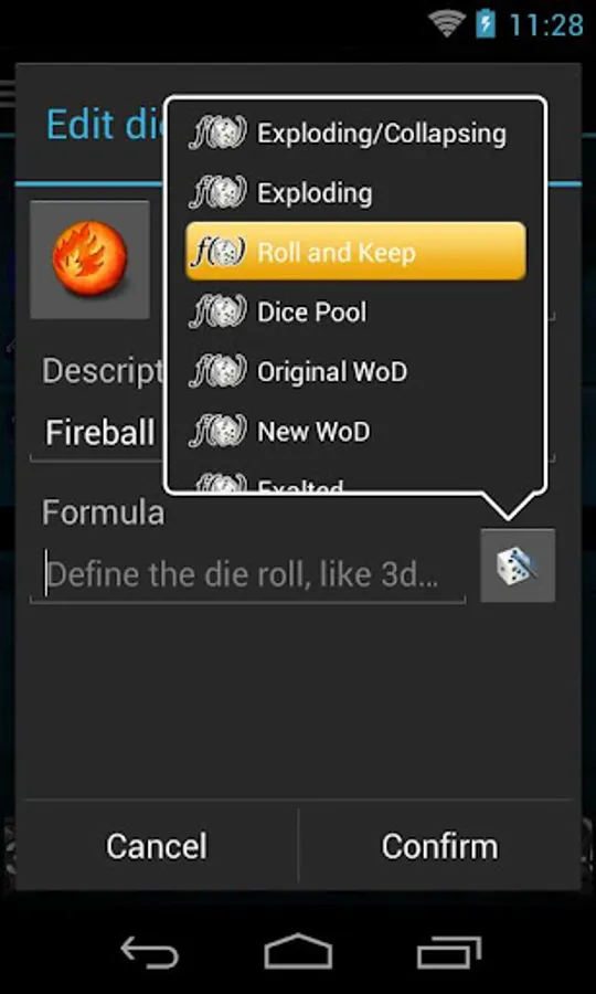 The dice can be added at will and organized in dice bags. Each die is defined by a formula such as 2d6+5 as well as special functions like rak(1d6,4,3) that allow to emulates the most complex game systems. An handy formulas builder simplifies the process, and allow to access to an online help. Check the list of all supported functions here: http://goo.gl/mZkcQS