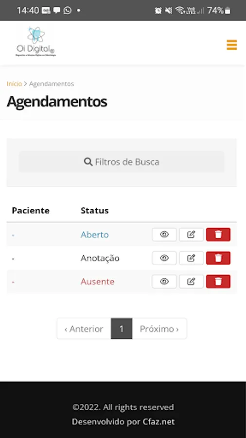 It is also possible to make appointments, PEP (Electronic Patient Record), Integration with any equipment that uses the DICOM protocol (PACS/Worklist), Financial Management, Control of Agreements and Glosses, everything can be accessed from anywhere by the clinic administrators.