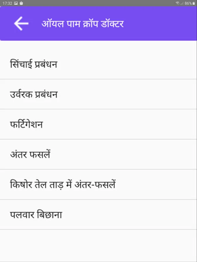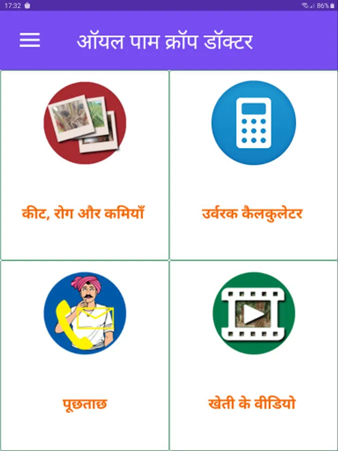 Oil palm crop doctors start with the installation registration of the mobile app in which farmers / users register on the login page, using their mobile number. After completing the registration, the launching screen appears after the dashboard screen of the app which provides four options viz. Fertilizer calculator; Displays videos of inquiries and harvests; .