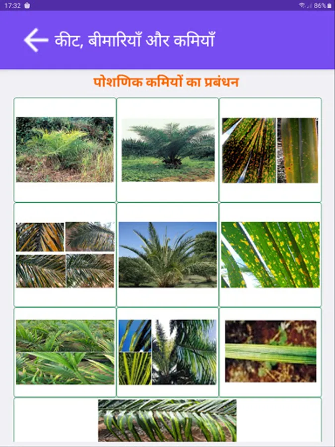 The Nashik Disease and Nutrient Deficiency module displays related images of oil palm pests, diseases and nutrient deficiencies. Upon selection of a specific image, information about specific pests, diseases and deficiency symptoms and control measures are displayed. If a video is attached, the option to watch the video clip is also available.