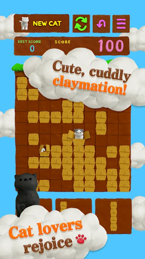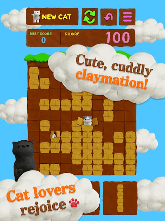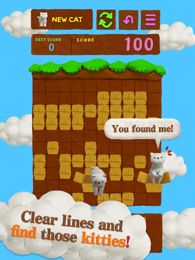 Each time a block disappears, a playful cat jumps out with a cheerful “meow.”