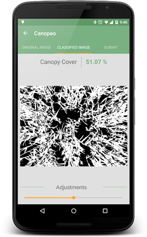 [3] In the next screen, compare the color image with the processed image to see whether the default settings are capturing the green pixels properly. In the processed image, the white pixels should match the green pixels in the original image. If you think that slight adjustments are needed to match the images, simply move the adjustments slider to correct the processed image. Typically the default settings provide accurate canopy cover estimates.