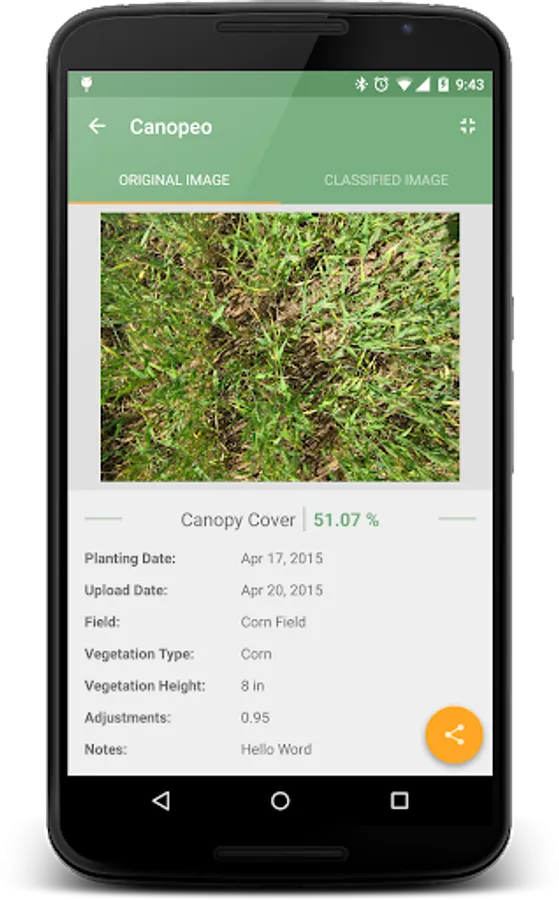 Canopeo enables you to add notes associated with each image and upload images to your account so that you can easily review and share the information gathered in the field from your office or at home at anytime. Canopeo automatically records the geographic coordinates and the current date and time so that you always know when and where each image was taken.