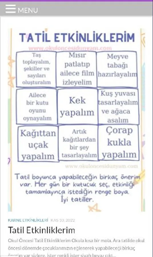 Compatible with the objectives and indicators targeted in the preschool education program; It is an application that supports cognitive, psychomotor, social and emotional development and self-care skills. In this application, there are art activities divided into categories, activities with certain days and weeks, reading and writing activities, Turkish language activities, mathematics, science and nature activities, game activities, and leftover material activities. From the first day of school to the last day of school, around 800 activities that you can do with children are now in your pocket with this application.