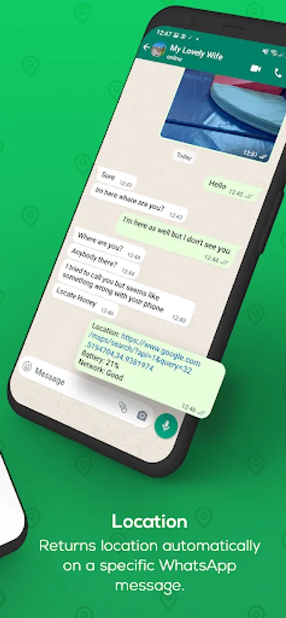Waloc returns the location of the device for a specific WhatsApp message that you define and sends a location URL through WhatsApp that shows the device location on Google Maps