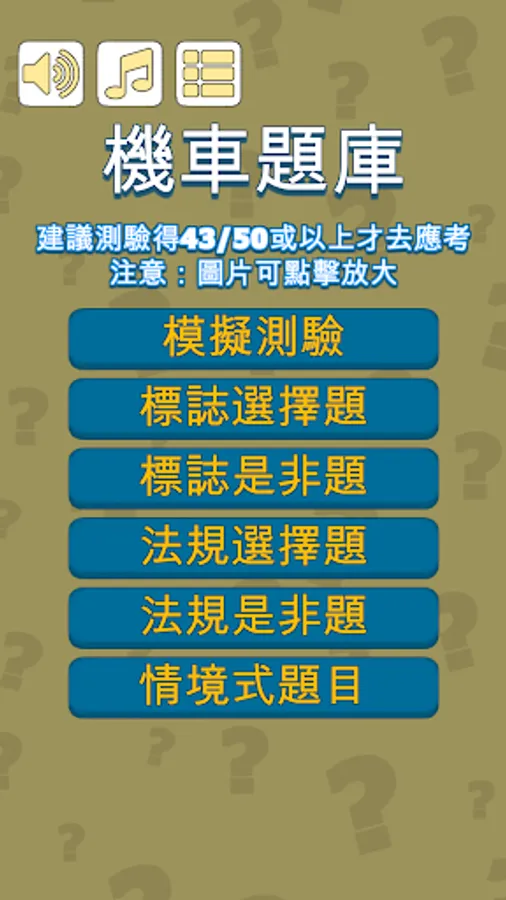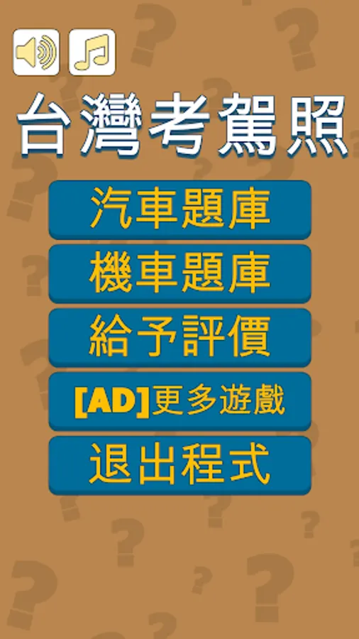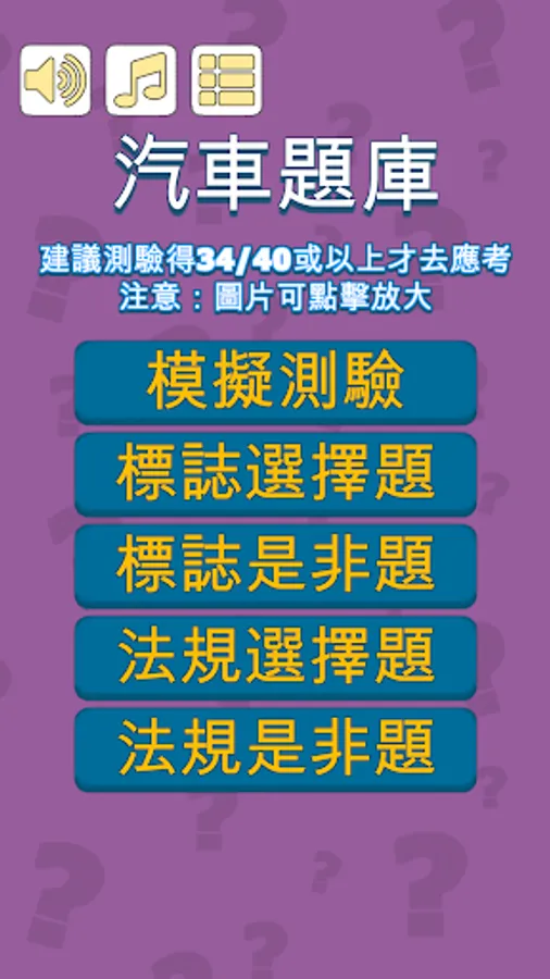 This program contains the latest version of the Taiwan Highway General Administration's driver's license written test library. There are about 1,600 questions for cars and motorcycles. All types of quizzes include logo questions, statutory questions, and situational questions. They will be presented as right or wrong or multiple choice based on the official questions.