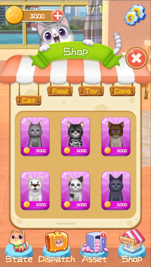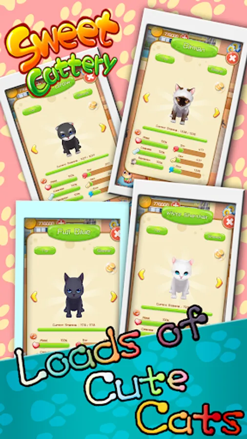 With your caring, cats will grow stronger and stronger. Buffing their perfomance in Quests and mini games.