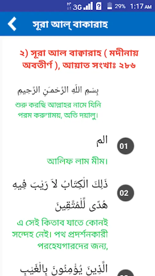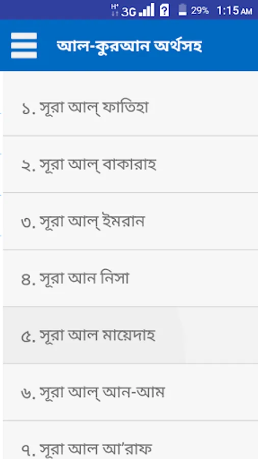 আল ফাতিহা, আল বাকারা, আল ইমরান , আন নিসা, আল মায়িদাহ , আল আনআম , আল আরাফ ,