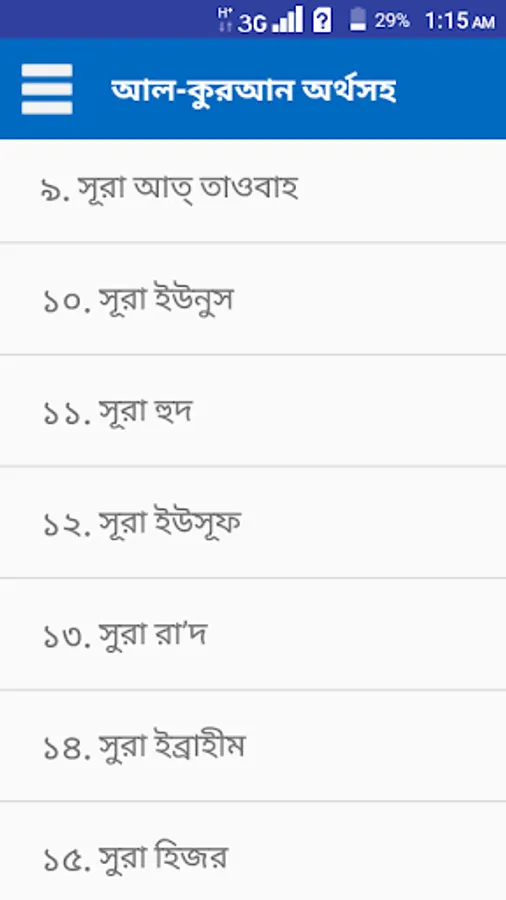 আল আনফাল , আত তাওবাহ্ , ইউনুস , হুদ, ইউসুফ, আর রা'দ, ইব্রাহীম, আল হিজর,