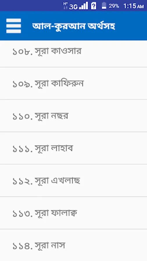 আল মাউন, আল কাওসার, আল কাফিরুন, আন নাসর, আল লাহাব, আল ইখলাস,