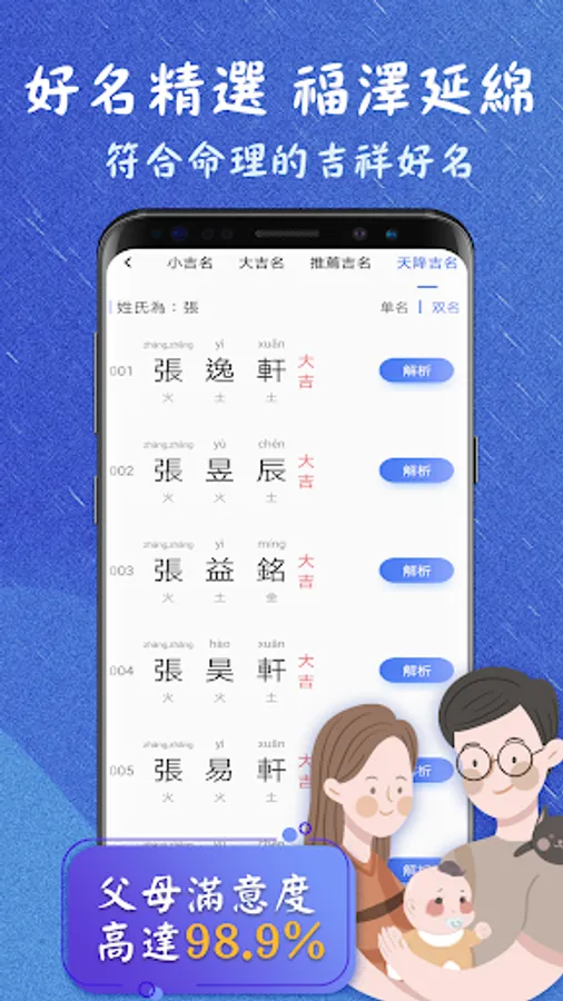 1. [Name and Resolve] According to your birth date and five elements theory, we will provide you with a name that matches your or your baby's fate (Note: Some names may not sound as good as expected, but they are indeed matched according to your fate. If you are not satisfied, you can ignore such names!)