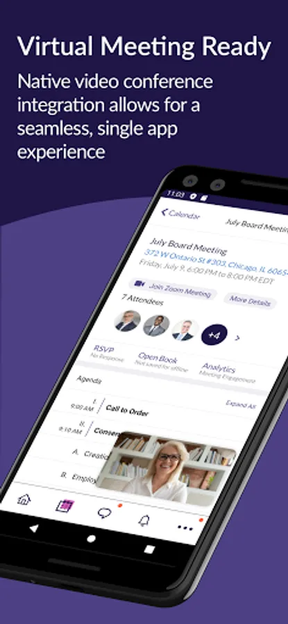 Key features include a seamless Zoom integration for virtual meetings, annotations, eSignatures, secure messaging, RSVP, voting and approvals, a resource library, offline access, multi-board and subcommittee support, and more.
