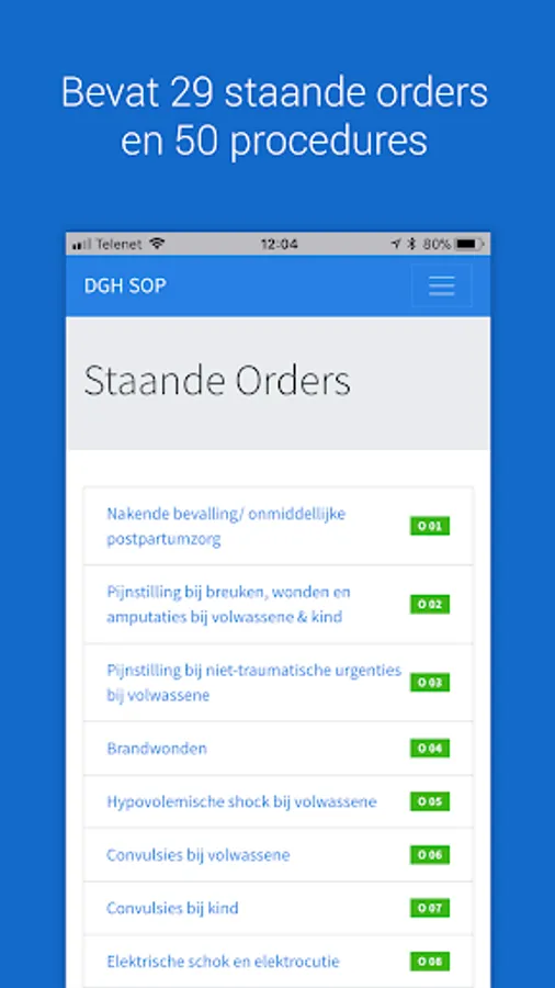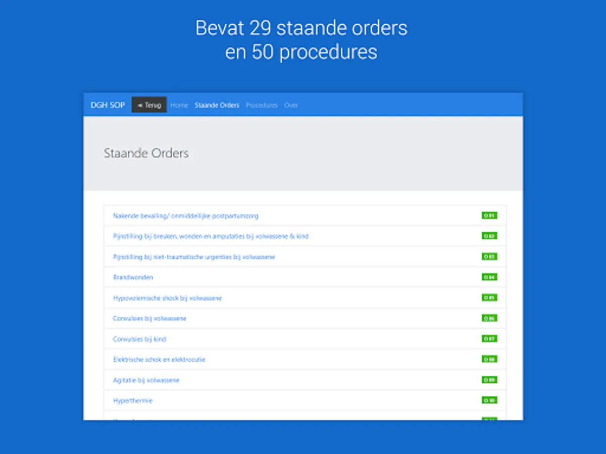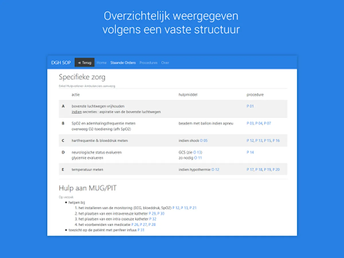 This release includes all 29 standing orders and 50 procedures. Through a simple selection you immediately get the information you want. The instructions are also interconnected so you do not always have to go through the menu.