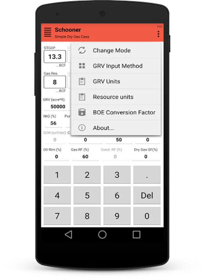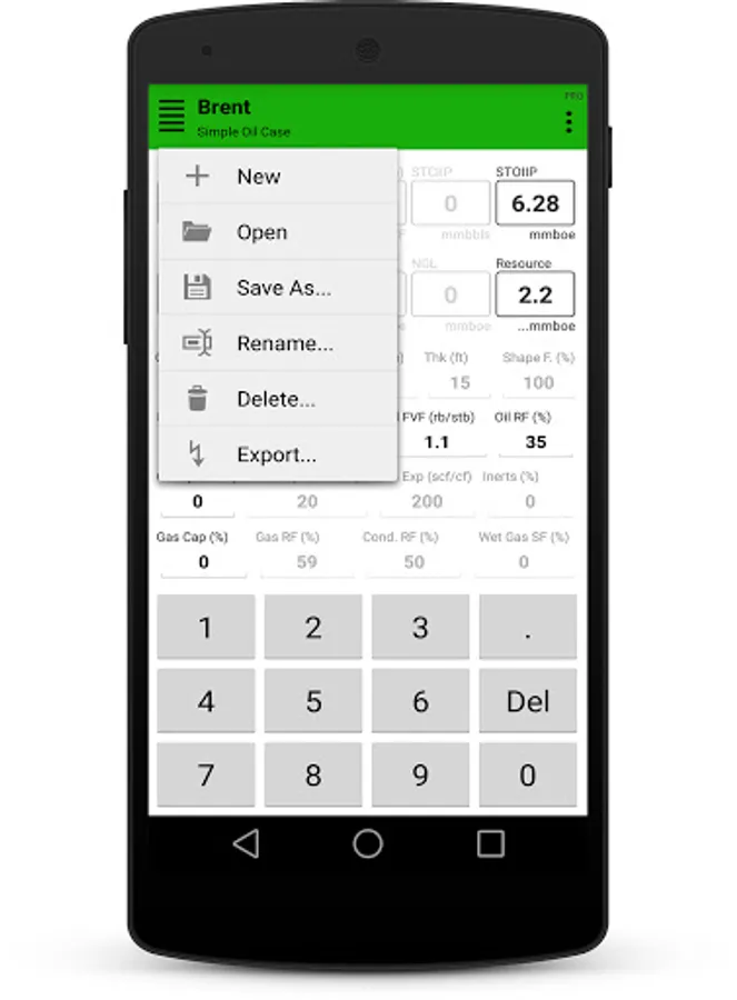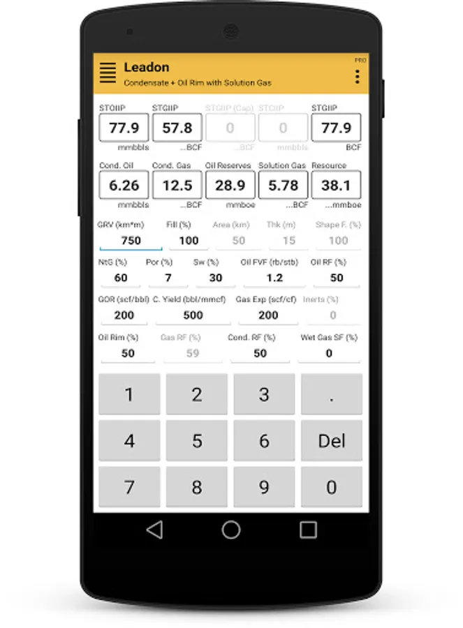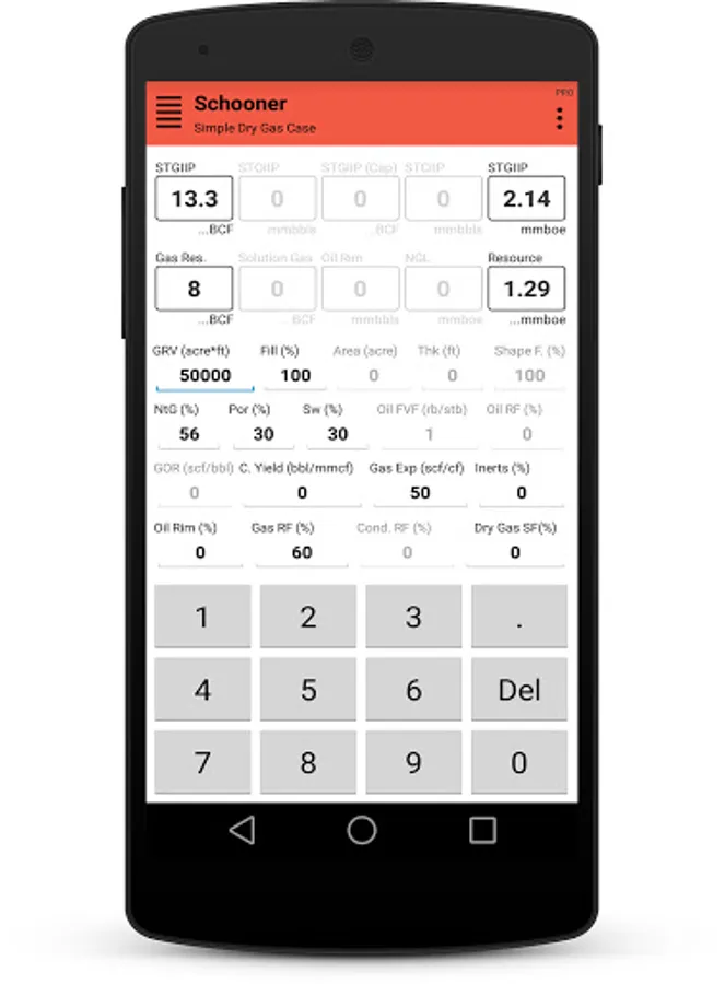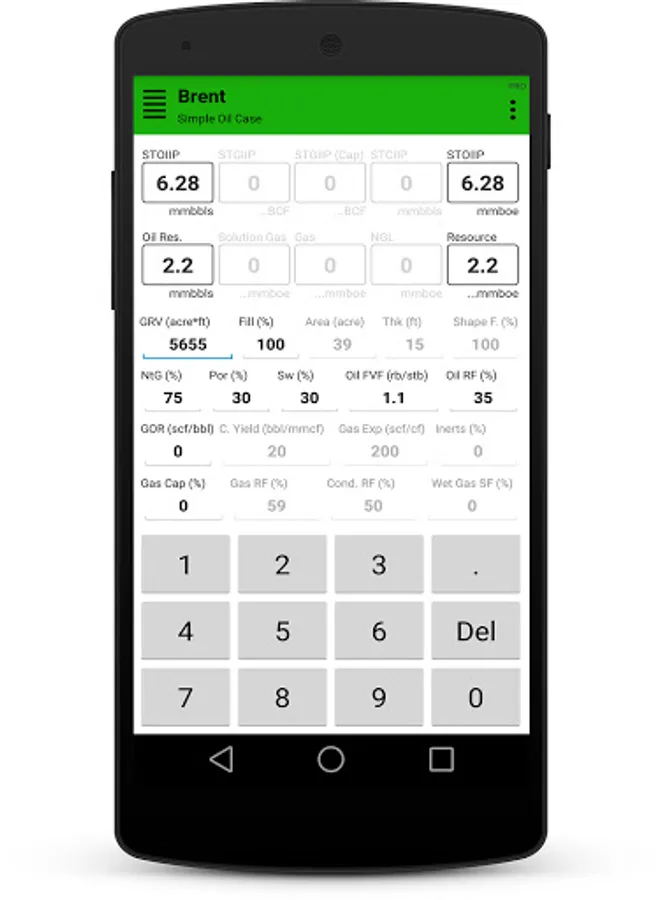 The app is able to handle separate oil, gas and condensate phases, as well as mixtures of all three including gas caps and oil rims. GRV (Gross Rock Volume) can be entered directly or as "Area x Thickness x Shape Factor” and input volume units can be handled in Field (acre*ft) or Metric (km*m) units. Final resource totals can be displayed in either Field (mmboe) or Metric (mmcm) units.