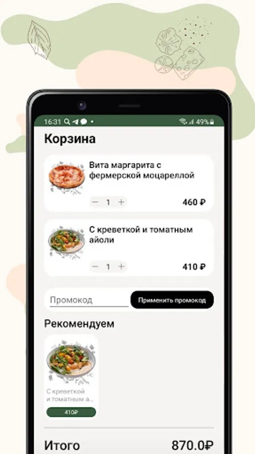 The "Vita Margarita" application provides a convenient and fast way to order food and homemade products to your home or office. We follow seasonality and relevance, as well as new trends, so that our menu always meets the needs and taste preferences of each guest. We offer about 50 different items, including Neapolitan pizza, homemade pasta and many other gastronomic delights.