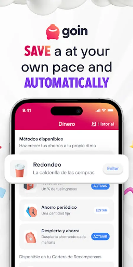 Whether it's buying a bike, paying for a master's degree, or jetting off to Cancun, Goin makes it a whole lot easier. You set the goal, and we'll help you save without the hassle. Automatic transfers to another account or dropping spare change into a piggy bank are nice, but then you have to retrieve that money, deposit it in the bank, hope it gets accepted... that's ancient history. Save effortlessly by rounding up your purchases (we'll stash away the ""change"" from each purchase so you can relax). Or you can even program a percentage to be saved in Goin each month and keep it safe from spending.