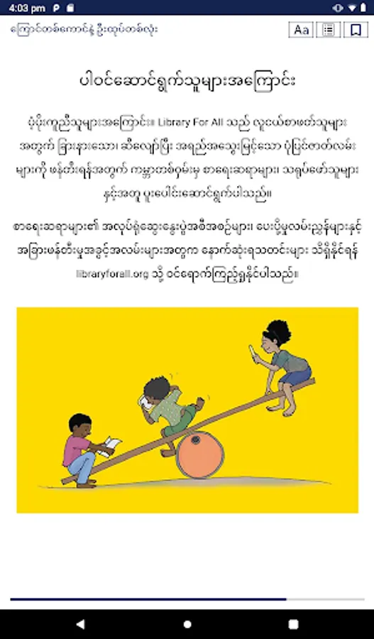 Read great books for free with Library For All. Kids, families and educators can find high quality children’s books to enjoy at home, or to fill resource gaps at school. LFA helps communities foster a love of reading. Find out more, including how to order low-cost print copies of the books in the app, at libraryforall.org.au.