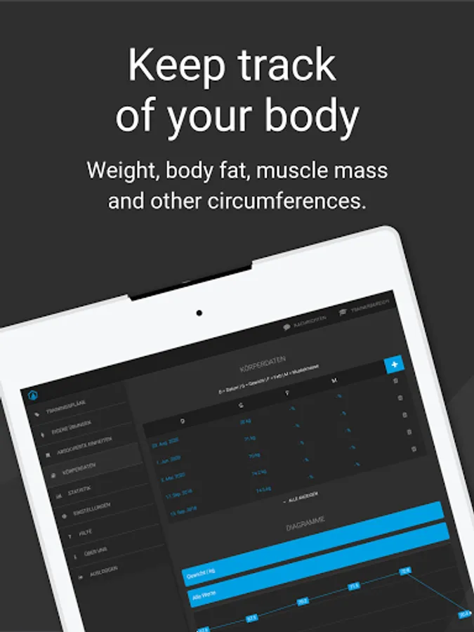 ✓ Track body weight, body fat and muscle mass as well as body circumferences
