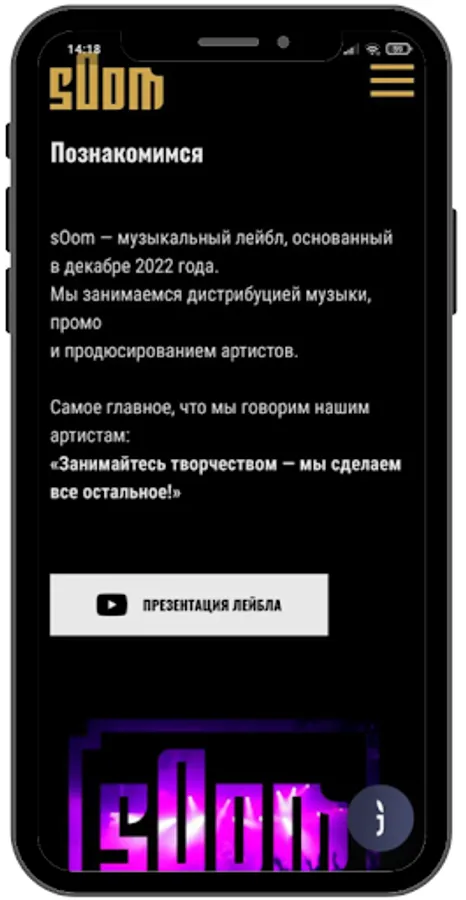 Russian label of all genres of music. We produce and distribute official music videos, videos and official audio in all different genres such as Ethno, Hip Hop, House, Rock, Dupstep and many more. The sOom label was created both for beginner musicians and already for celebrities who value their work and want to make good money on their work. We know how to bring your music to the right audience.