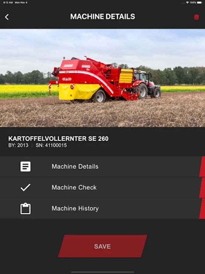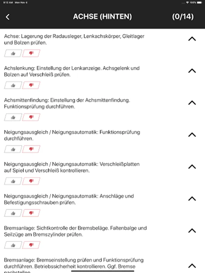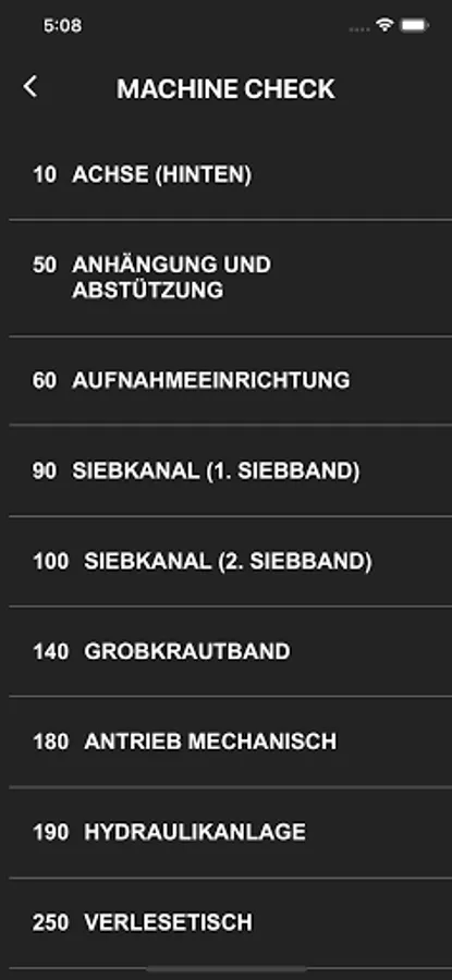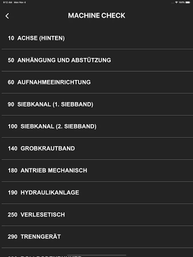 With Werkstatt-App we have created an easy tool to audit GRIMME machines. The yearly check-up can be performed step by step, guiding the user through questions while checking each part and reporting damaged parts. Spare parts lists are shown and can be picked directly for the report. Each check-up is saved in the app so that the user has a direct overview of all previous check-ups.