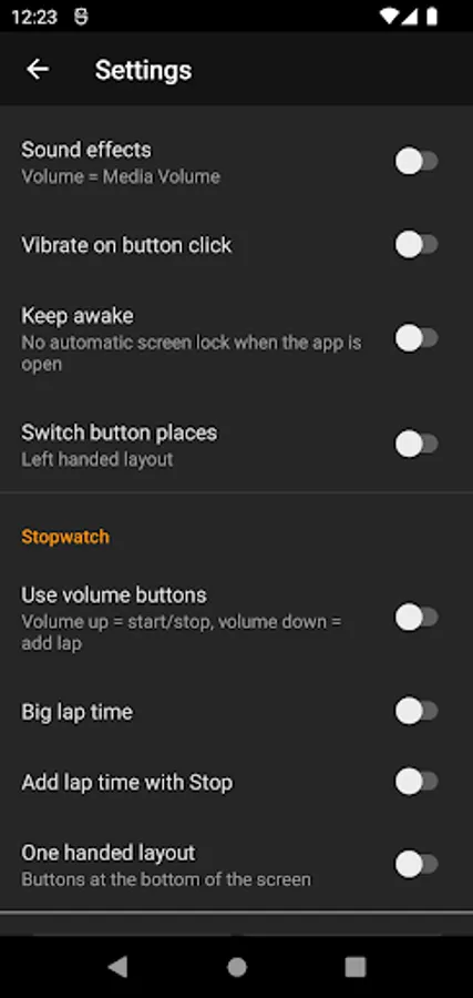 - Stopwatch control with volume keys: volume down = new lap time and volume up = start or stop