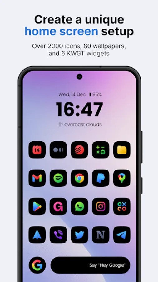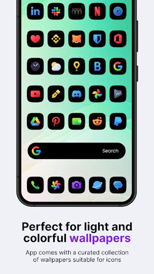 Introducing our squircle android icon pack - Ares Black. A unique and stylish collection of colorful glyph icons on a black squircle, perfect for any modern Android phone. With a focus on simplicity and elegance, these icons feature clean lines and a minimalist design that will elevate the look and feel of your homescreen and app drawer. The pack includes over 3,375 icons, 90 wallpapers, and 7 KWGT widgets to complete the look of your homescreen. For the price of one app, you get content from three different apps! Take your homescreen design to the next level with our Ares Black icon pack today!