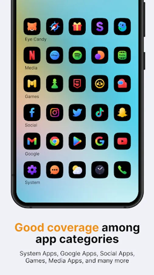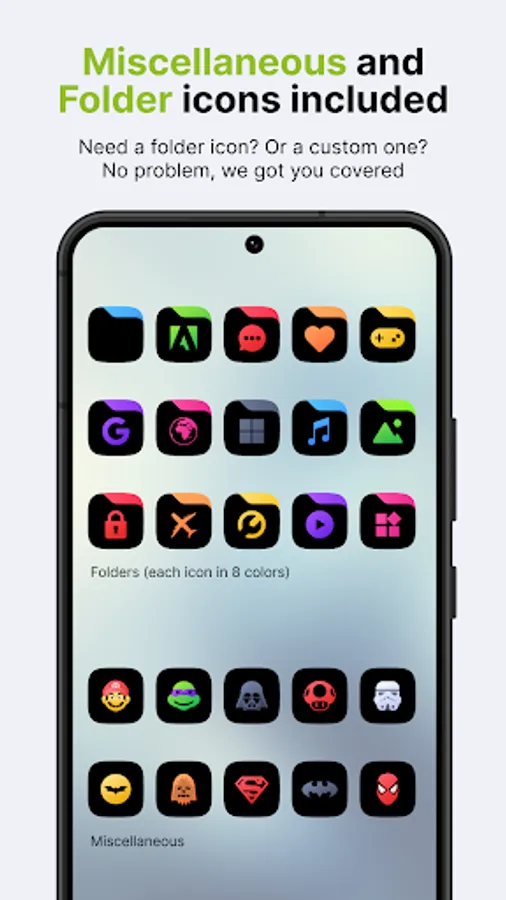 All our icon packs contain alternate icons for many popular apps, dynamic calendar icons, masking of unthemed icons, folders, and miscellaneous icons (you need to apply them manually).