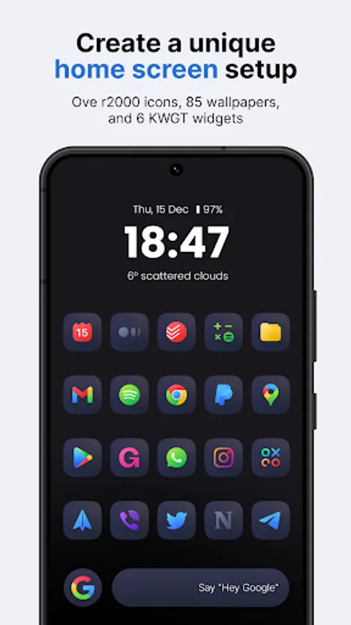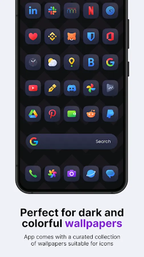 Introducing our squircle android icon pack - Ares Dark. A unique and stylish collection of colorful glyph icons on a dark squircle, perfect for any modern Android phone. With a focus on simplicity and elegance, these icons feature clean lines and a minimalist design that will elevate the look and feel of your homescreen and app drawer. The pack includes over 3,375 icons, 90 wallpapers, and 7 KWGT widgets to complete the look of your homescreen. For the price of one app, you get content from three different apps! Our Ares Dark icon pack will take your homescreen design to the next level!