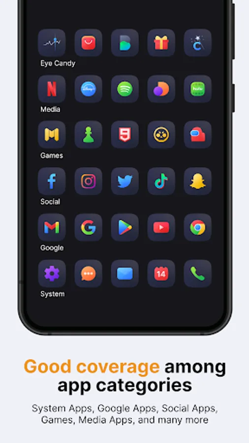 All our icon packs contain alternate icons for many popular apps, dynamic calendar icons, masking of unthemed icons, folders, and miscellaneous icons (you need to apply them manually).