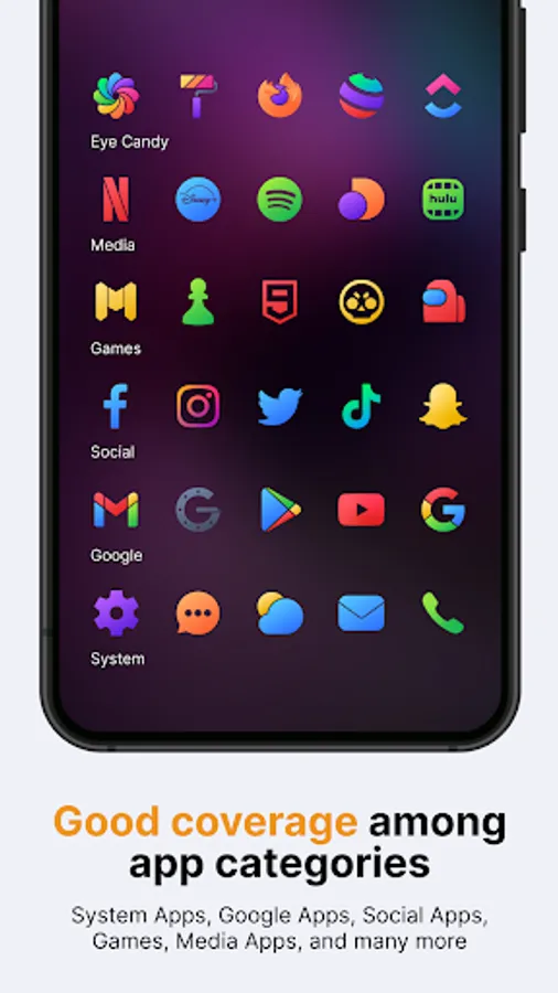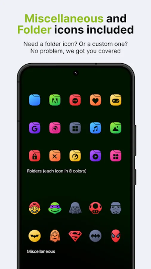 All our icon packs contain alternate icons for many popular apps, dynamic calendar icons, masking of unthemed icons, folders, and miscellaneous icons (you need to apply them manually).