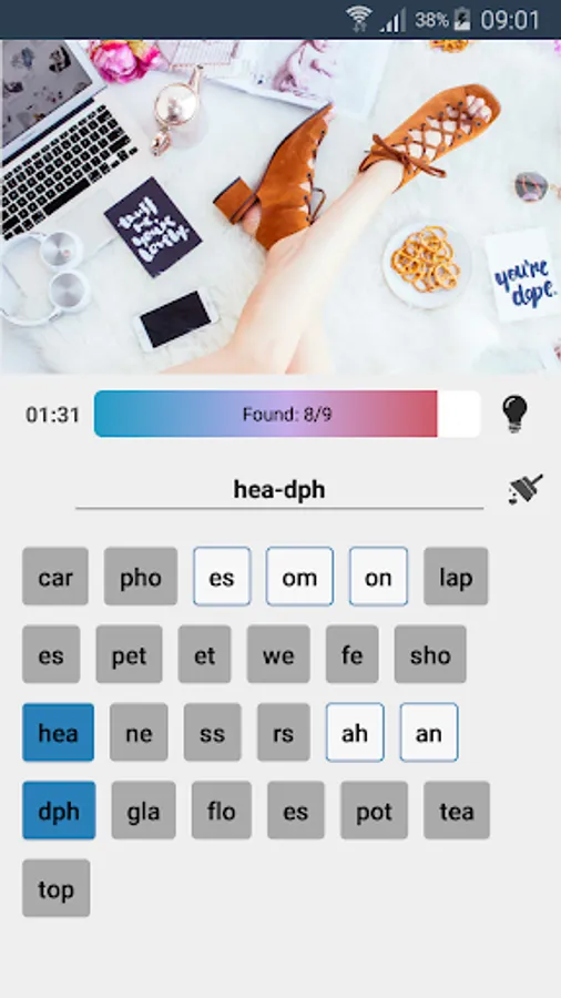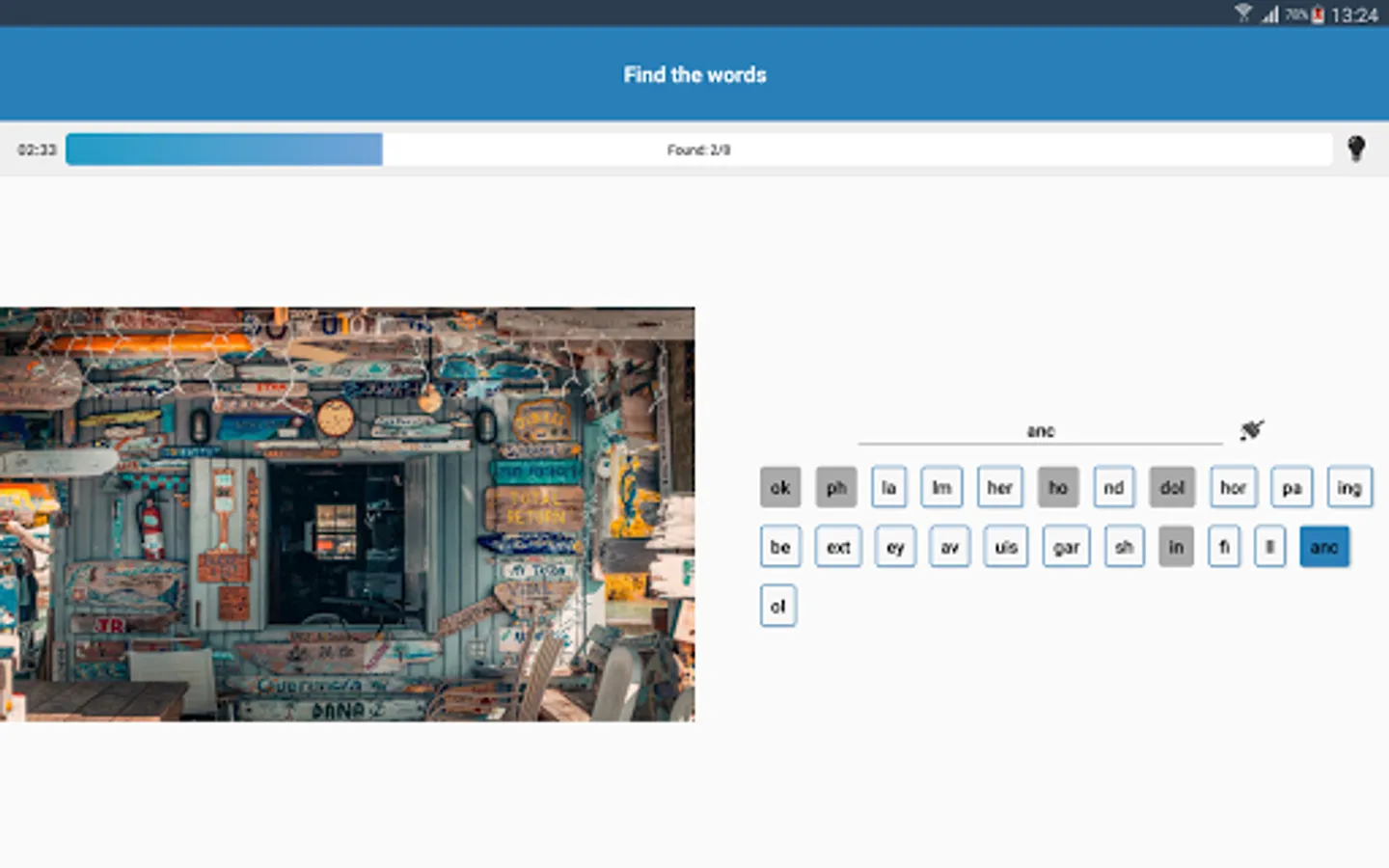 In each round of the game you have to find a few words on the picture. All words are broken in syllables.