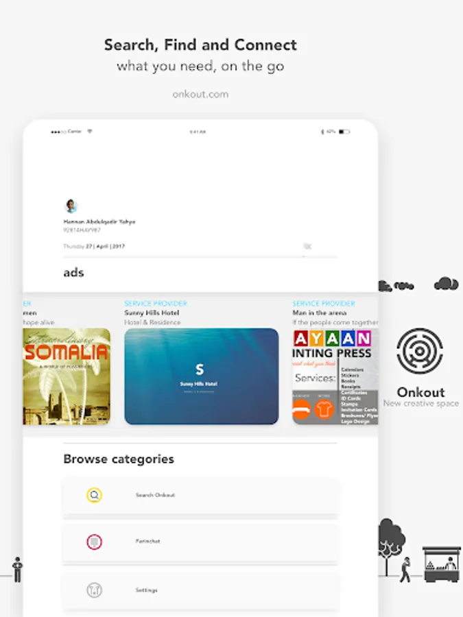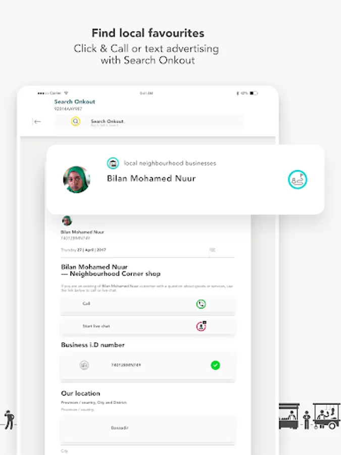 You can find, contact, book and review local businesses on the go with the Onkout app. With over thousands of Somalia businesses listed, the Onkout platform feature Search Onkout is the leading business directory in Somalia and aboard over 4 countries.