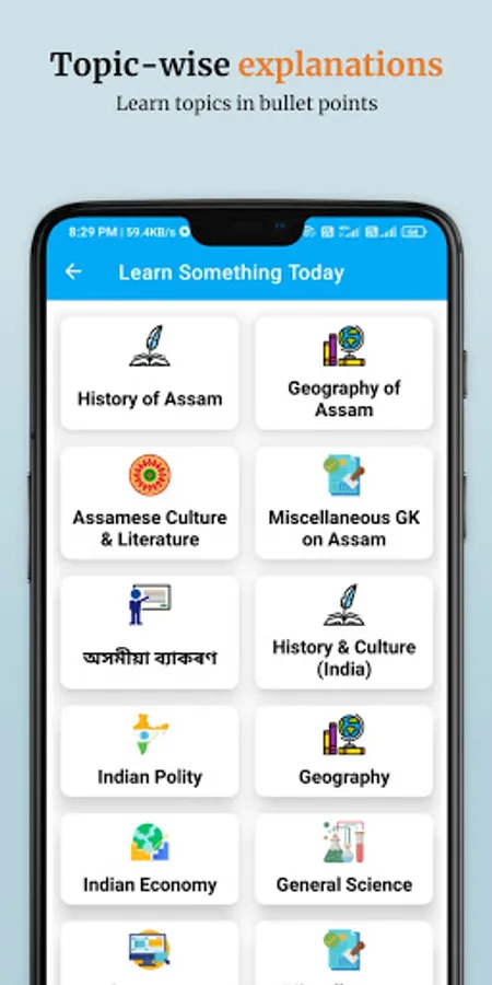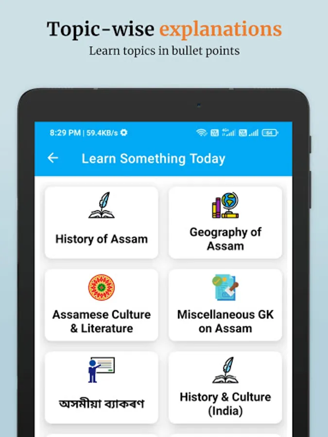 This app primarily emphasize on general awareness related to Assam, which will give the learners extensive facts and knowledge on Assam which are frequently asked in recruitment examinations. There is 600+ MCQs related to Assam which will help the candidates for examinations like Assam Police recruitment, Assam TET and other government recruitment tests.