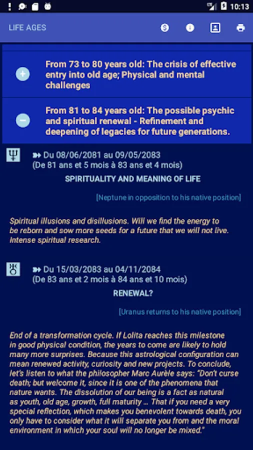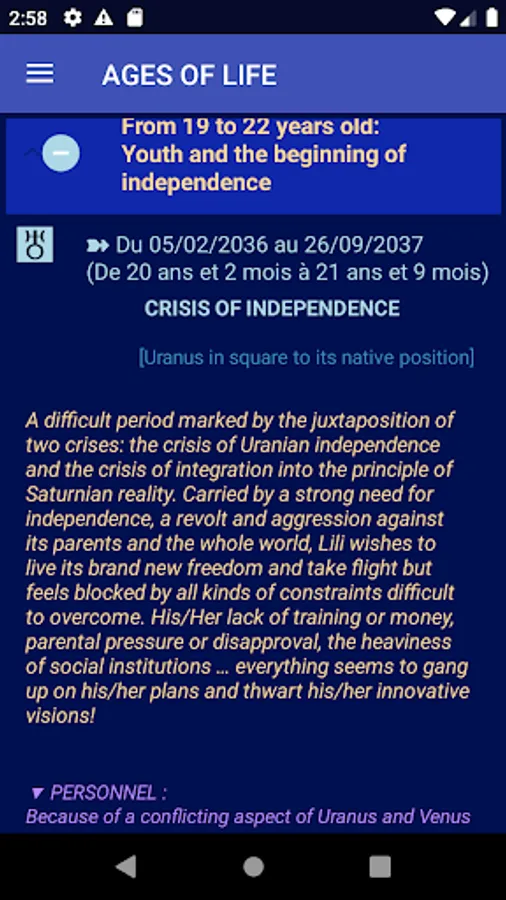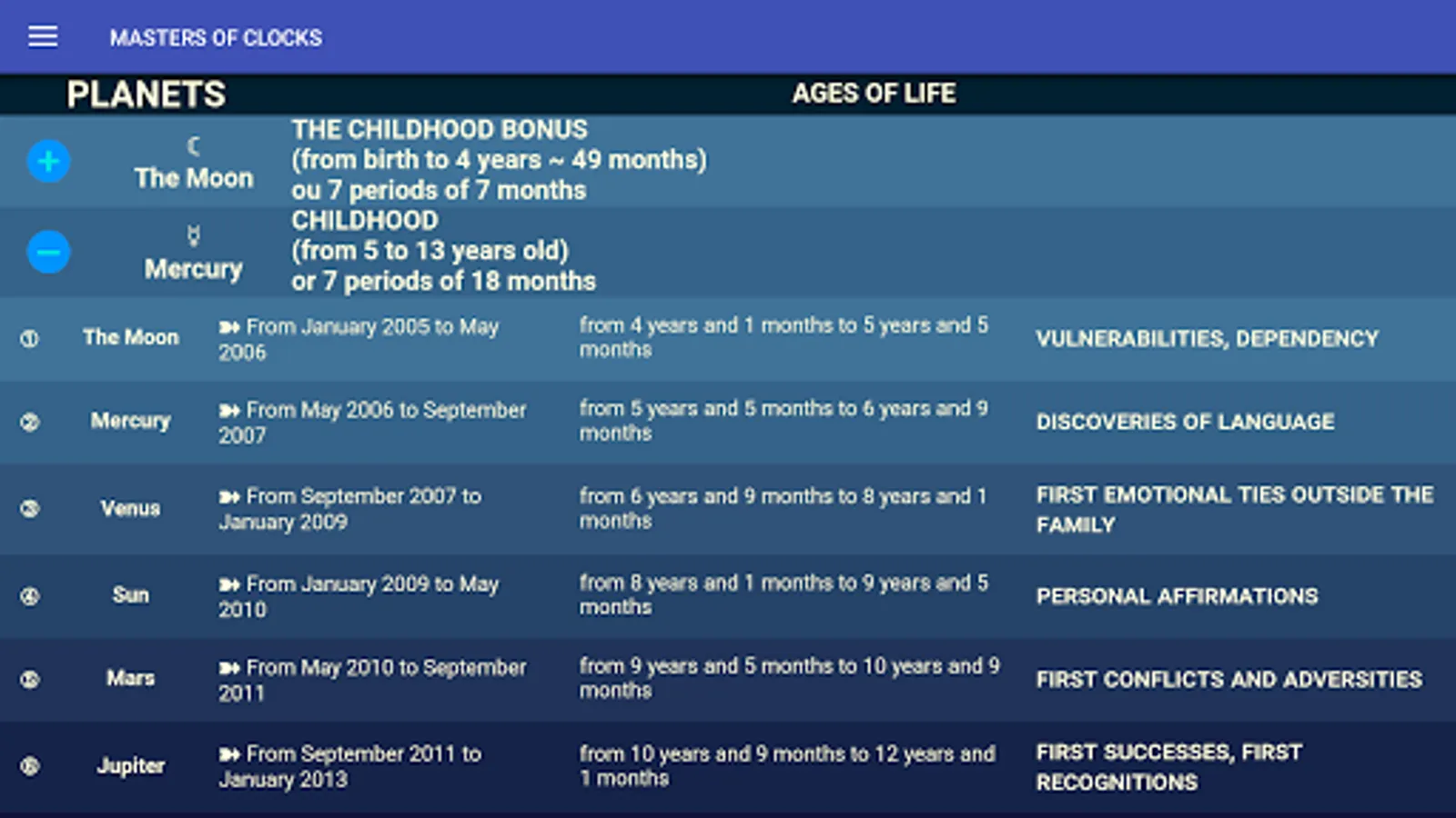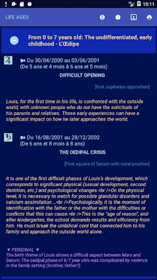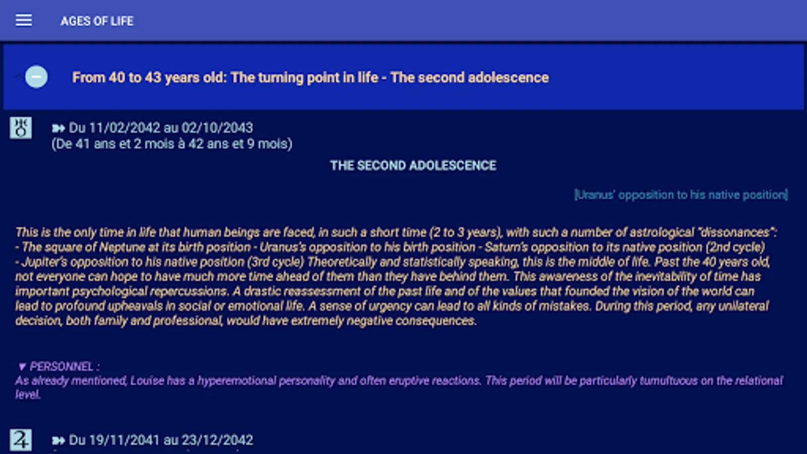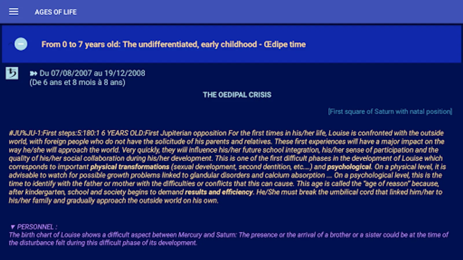 It calculates all the key dates and all the periods which marked or will mark your psychological maturation. Each of these periods is dated and commented.