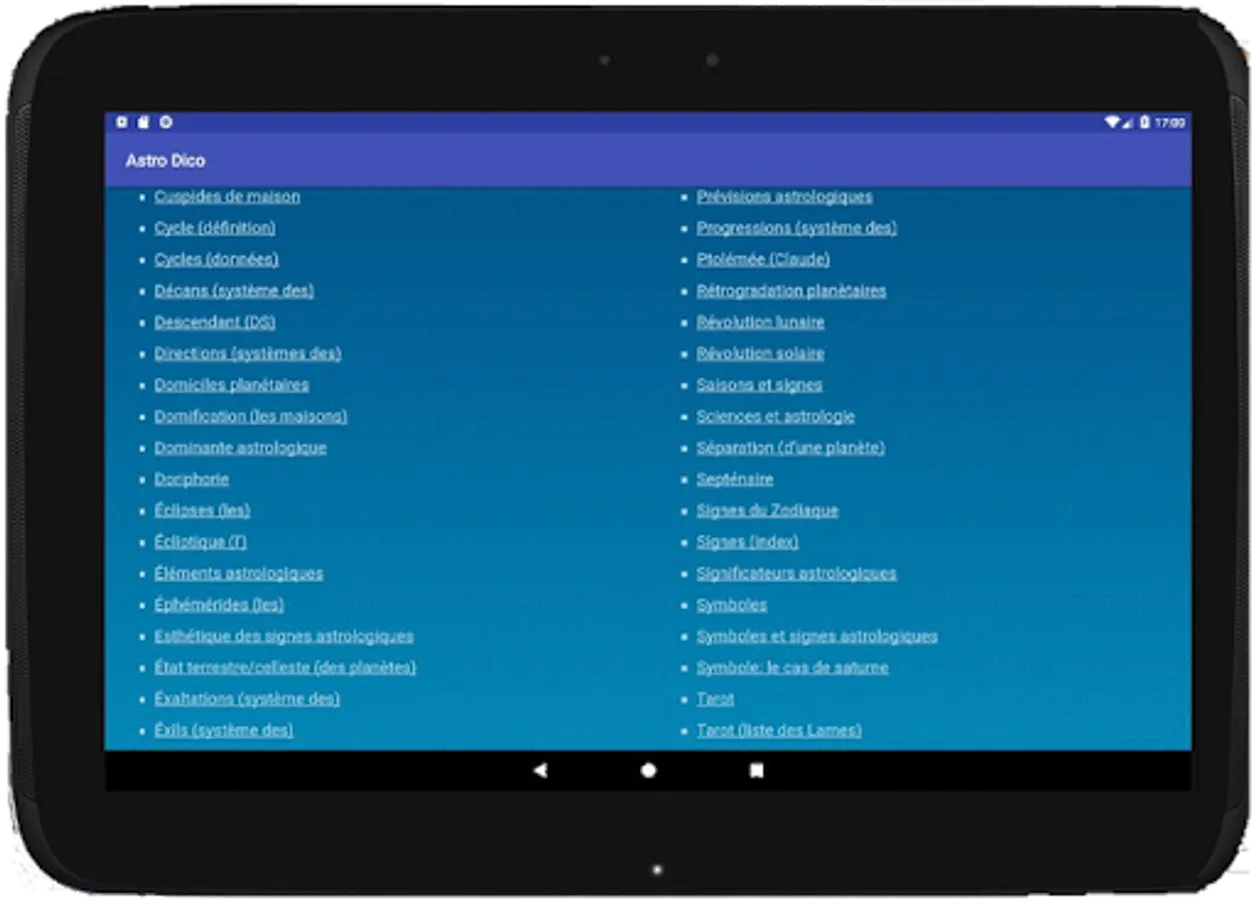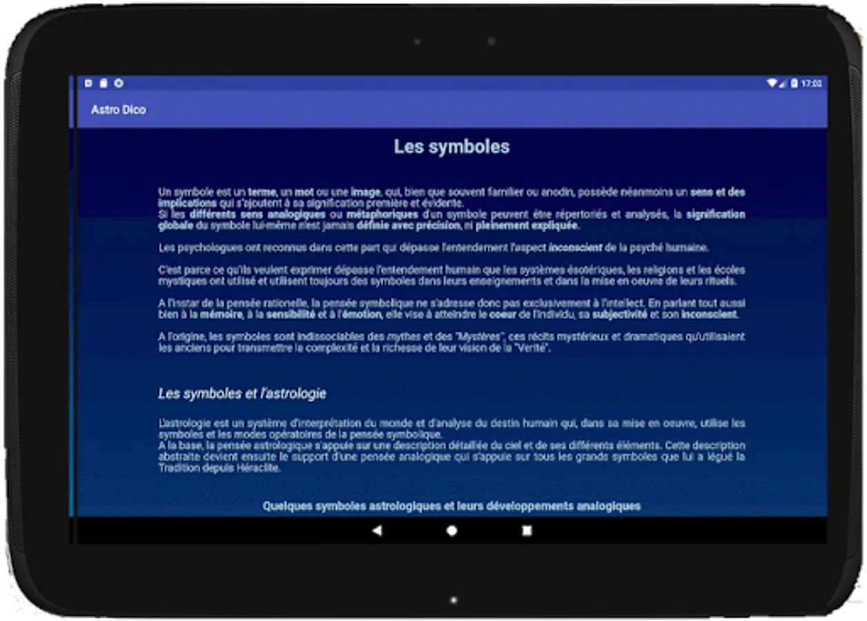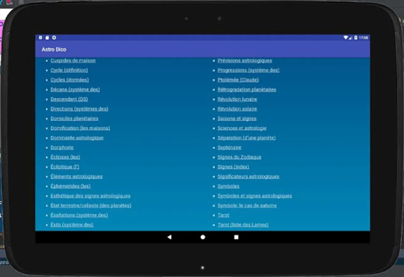This astrological dictionary is a tool that has been thought out and designed for students of astrology. It brings together definitions of words and concepts commonly used by Western astrology. For those who are new to it, this application will quickly become an extremely useful vade-mecum that they will consult daily and for months on end, the time to assimilate all the concepts and retain all the technical data related to this ancestral knowledge.