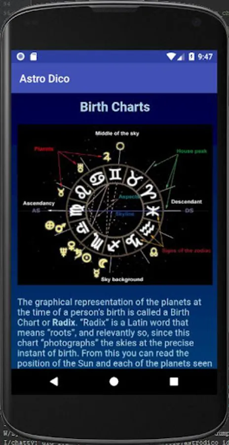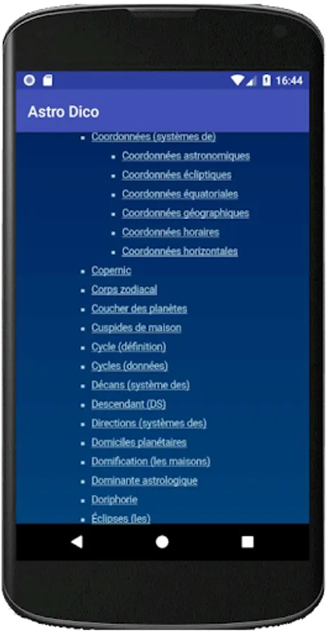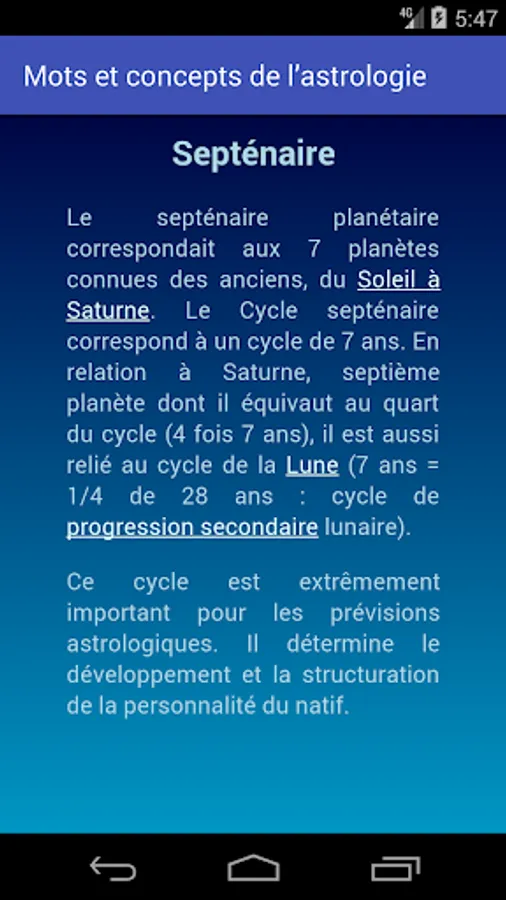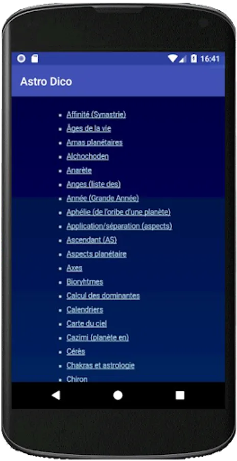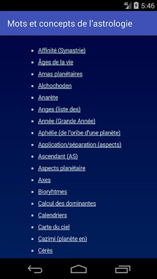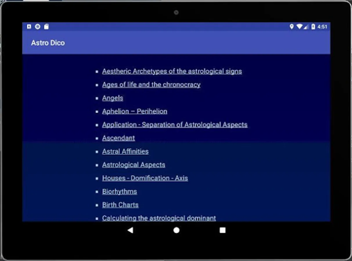 This astrological dictionary is a tool that has been thought out and designed for students of astrology. It brings together definitions of words and concepts commonly used by Western astrology. For those who are new to it, this application will quickly become an extremely useful vade-mecum that they will consult daily and for months on end, the time to assimilate all the concepts and retain all the technical data related to this ancestral knowledge.