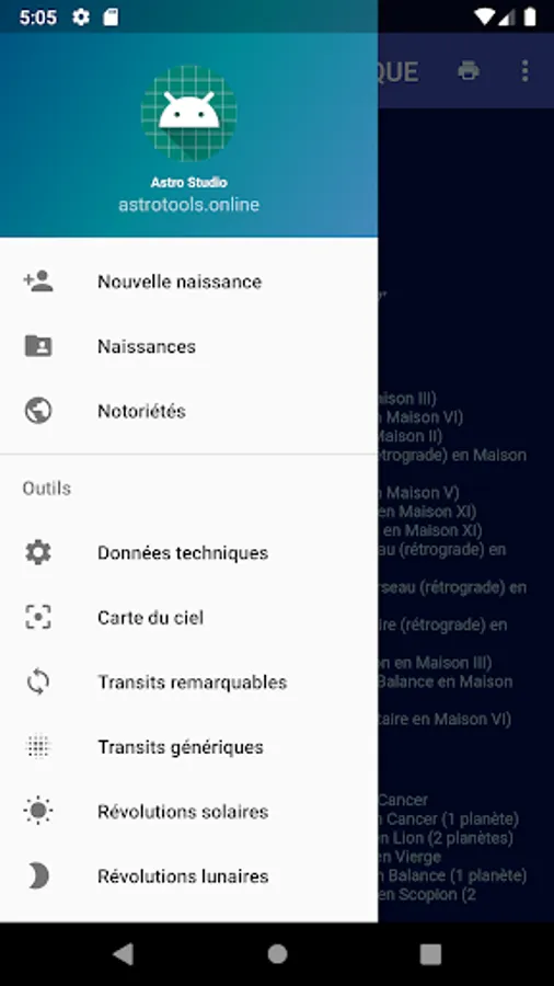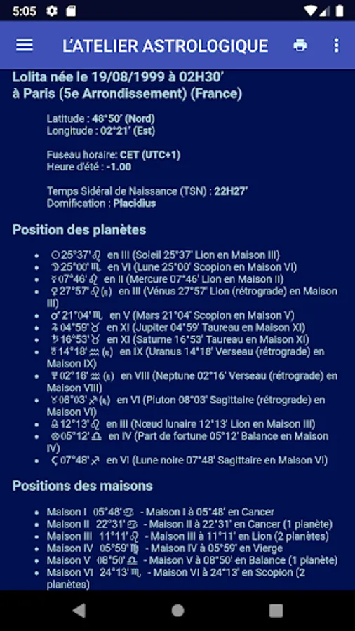 This application has been specially designed for astrologers or for students of Astrology who wish to free themselves from the daunting calculations imposed by their learning or practice. It includes a database that allows you to register as many people as desired. With this tool, you have all the functions of astrological calculations: the data is instantly available and readable in several formats.