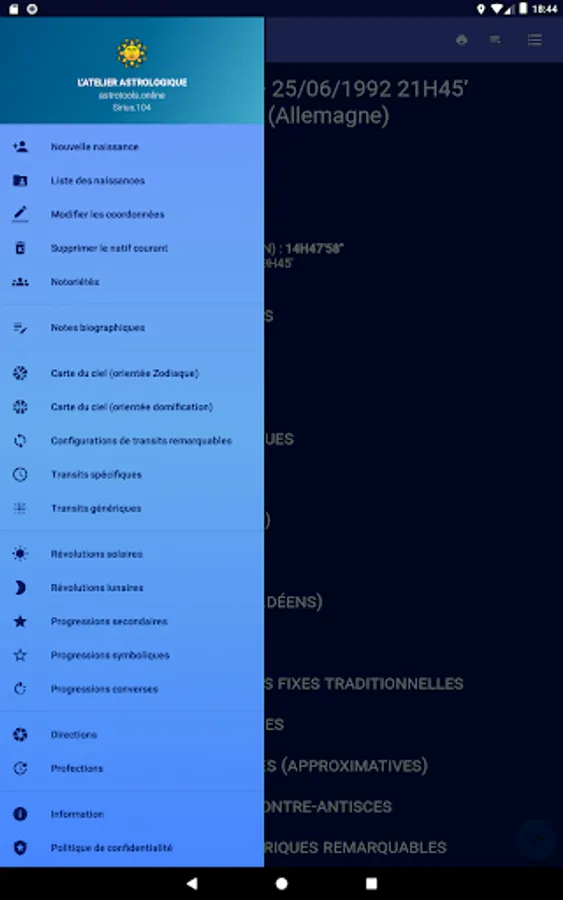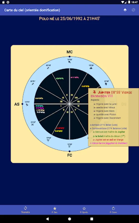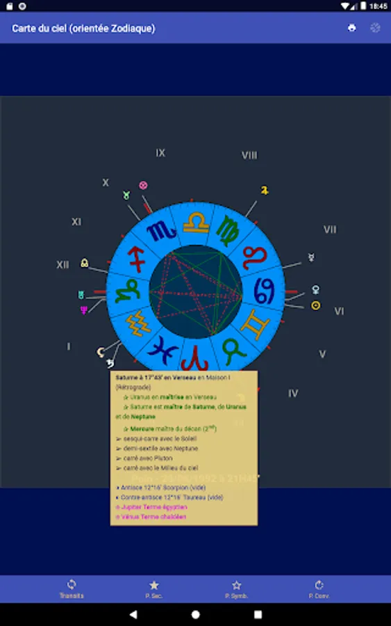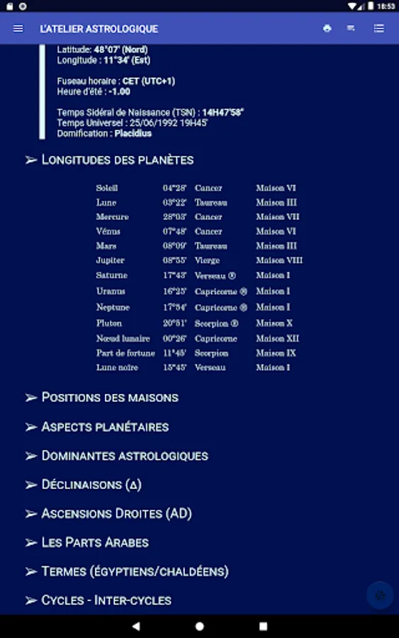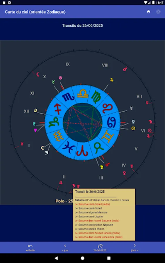 The chart of the sky which is the basic visual instrument of any astrologer; the one implemented by the application delivers, in addition to the traditional basic graphics, a wealth of information: