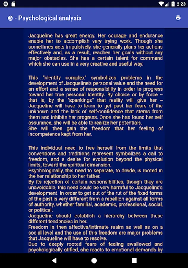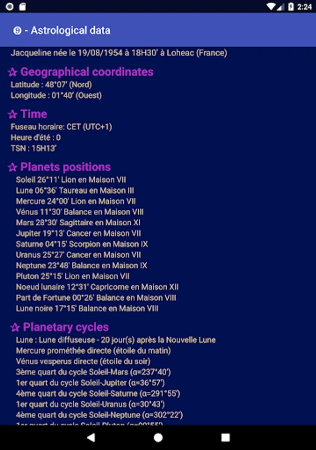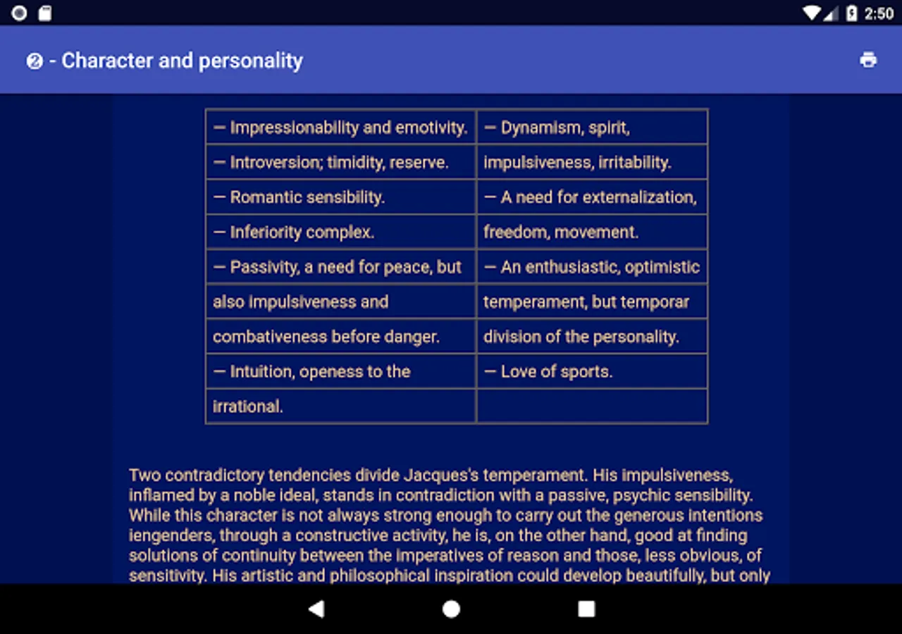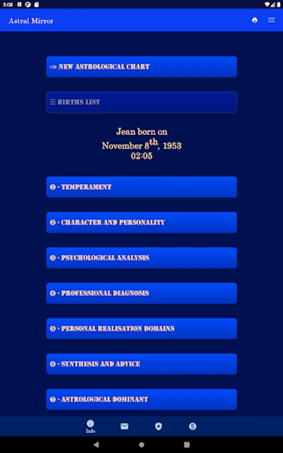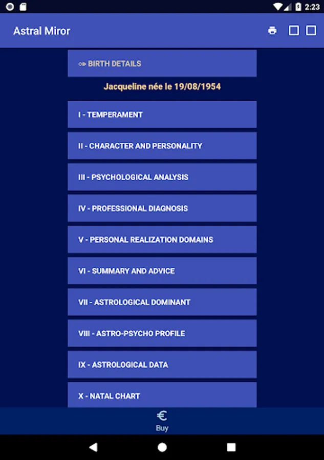 The free version of the app is fully functional. The interpretation of the second chapter (Character and personality) is issued to you free of charge so that you realize the richness of your "Astral Mirror". You can acquire online as much interpretation of astral themes as you want.